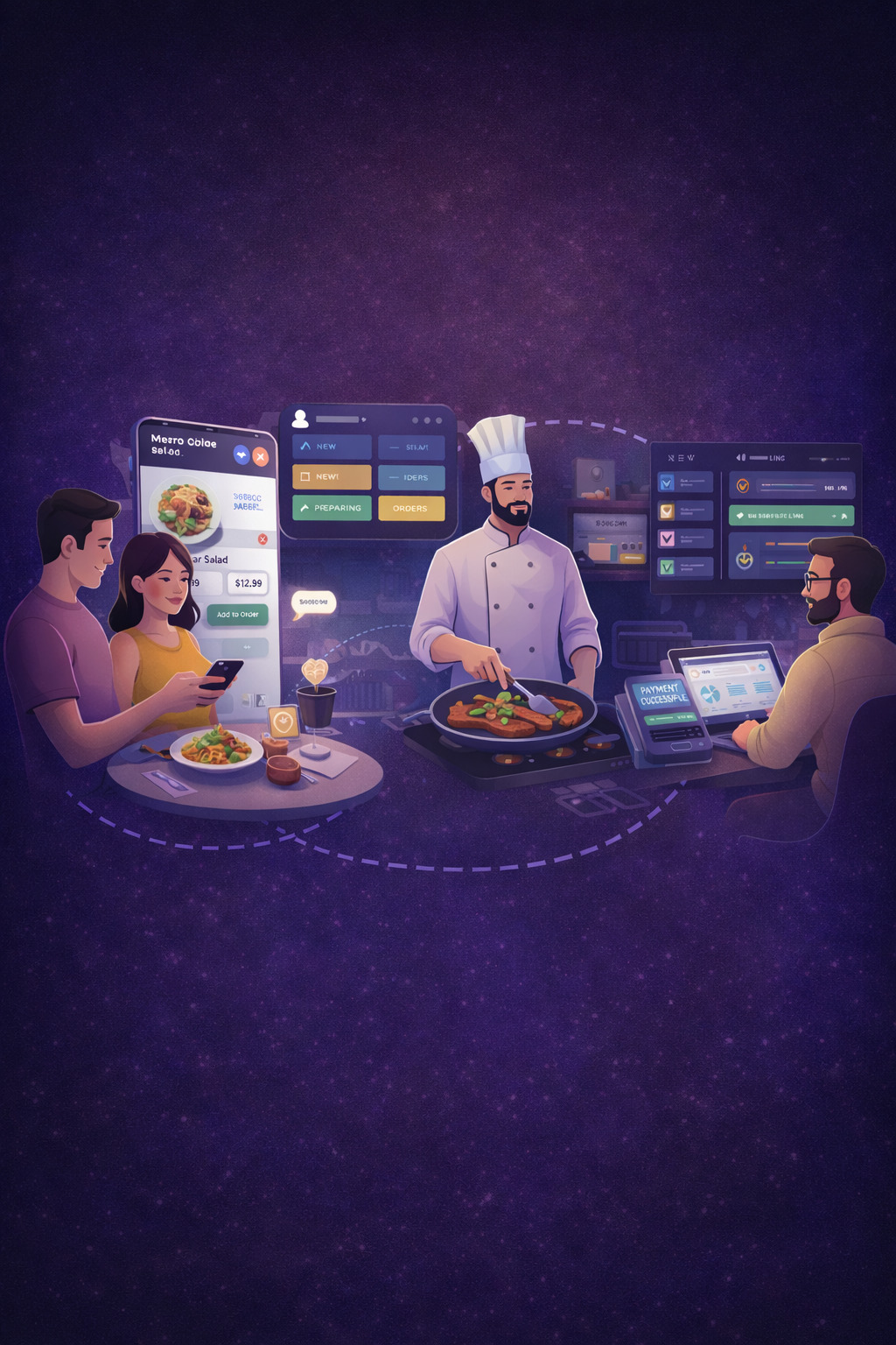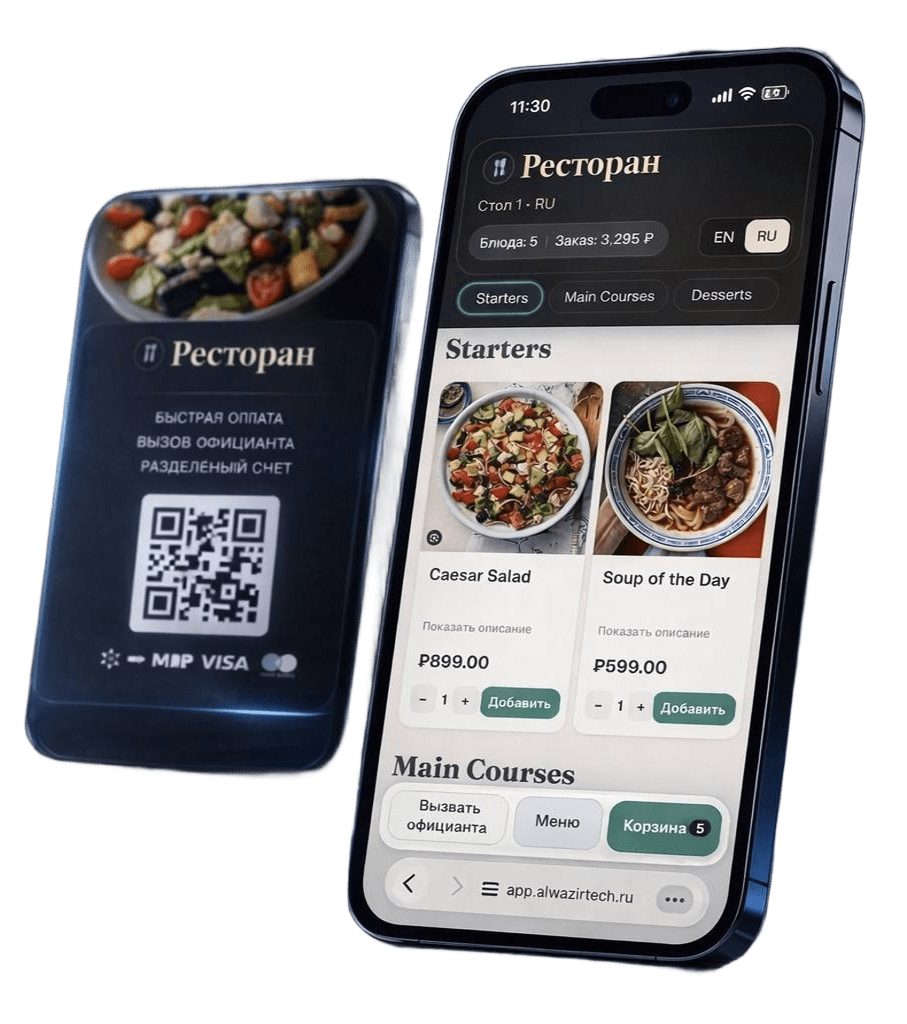AlwazirTech помогает ресторану ускорять обслуживание, сокращать ошибки в заказах, увеличивать средний чек и давать владельцу больше видимости по работе зала.