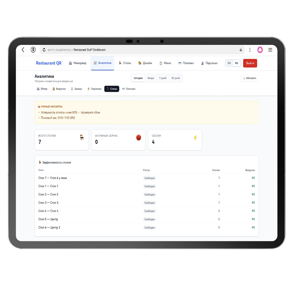 Владелец и персонал видят заказы, статусы и активность заведения.